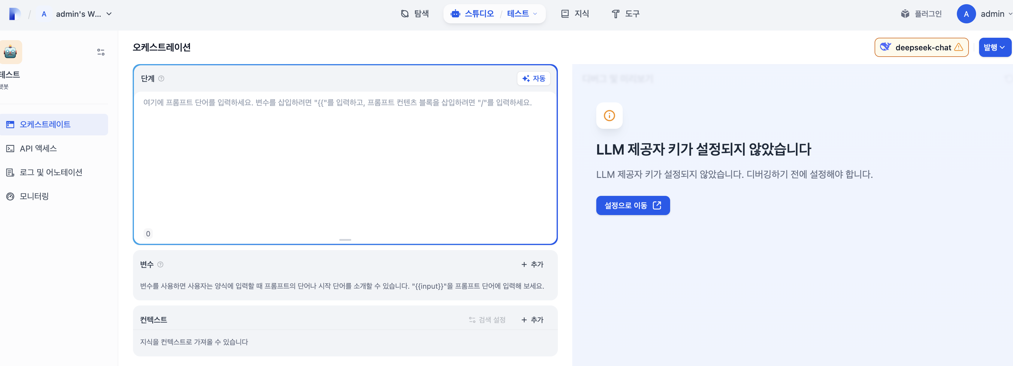 오른쪽에 보면 LLM제공자 키를 설정하라는 안내도 나온다.