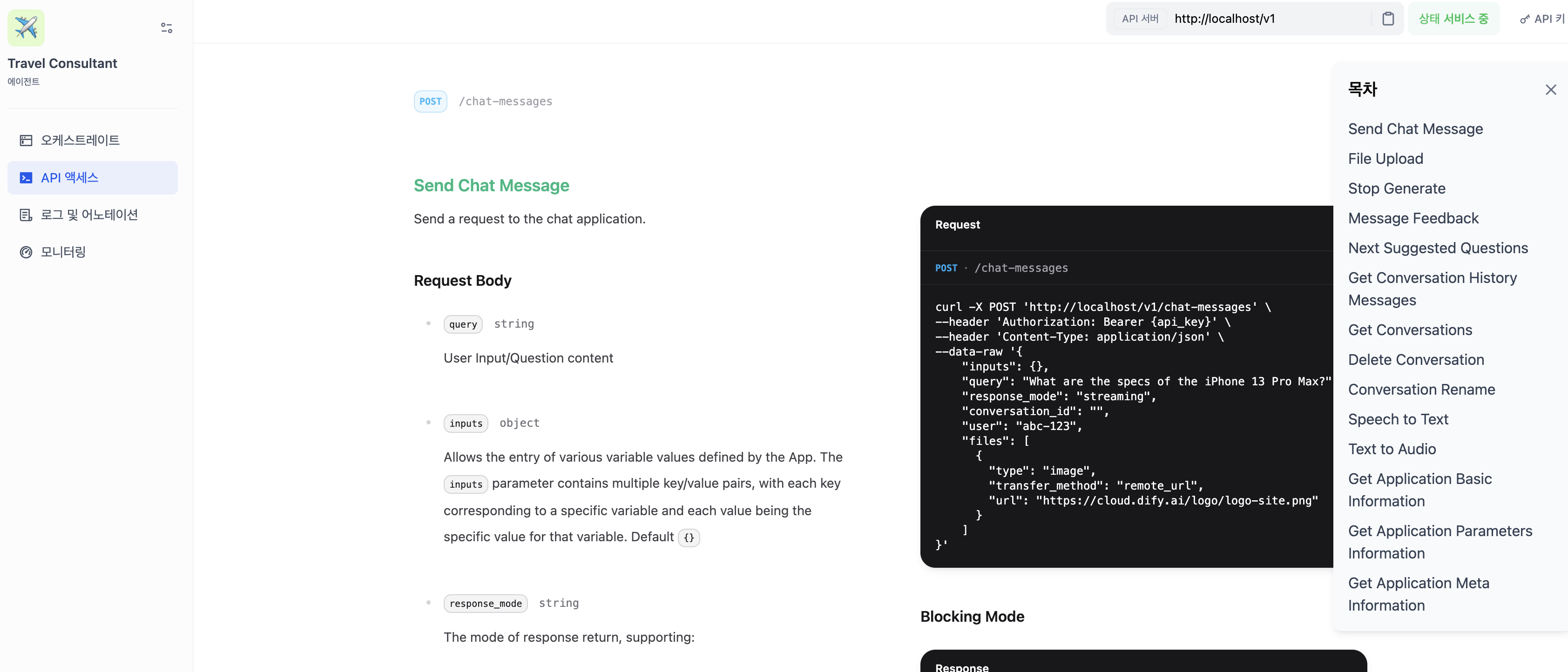 메세지를 보내는 API부터 각 목차에 따라 API docs를 제공해준다.