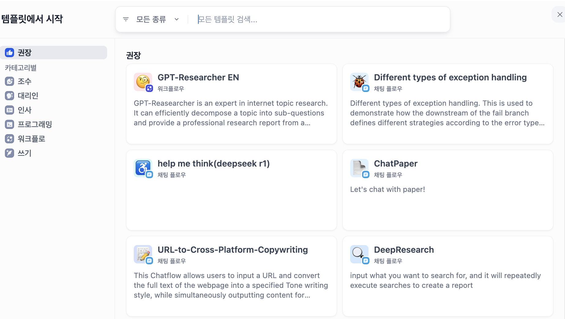 템플릿으로 만들게 되면, 이렇게 카테고리별로 만들수 있는 LLM서비스를
