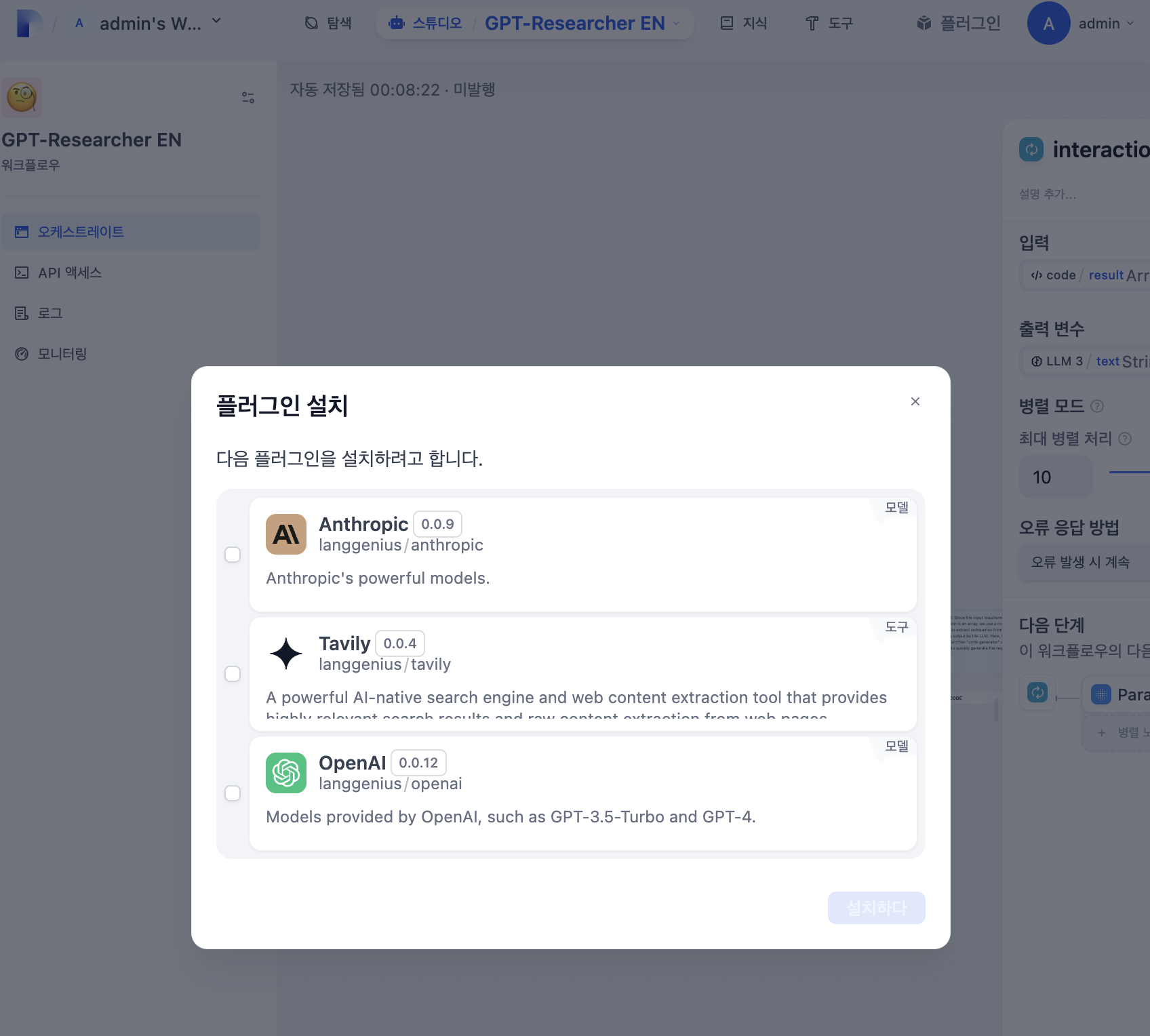 이렇게 OpenAI를 비롯한 여러가지 필요한 플러그인 설치가 필요한 안내를 받는다.