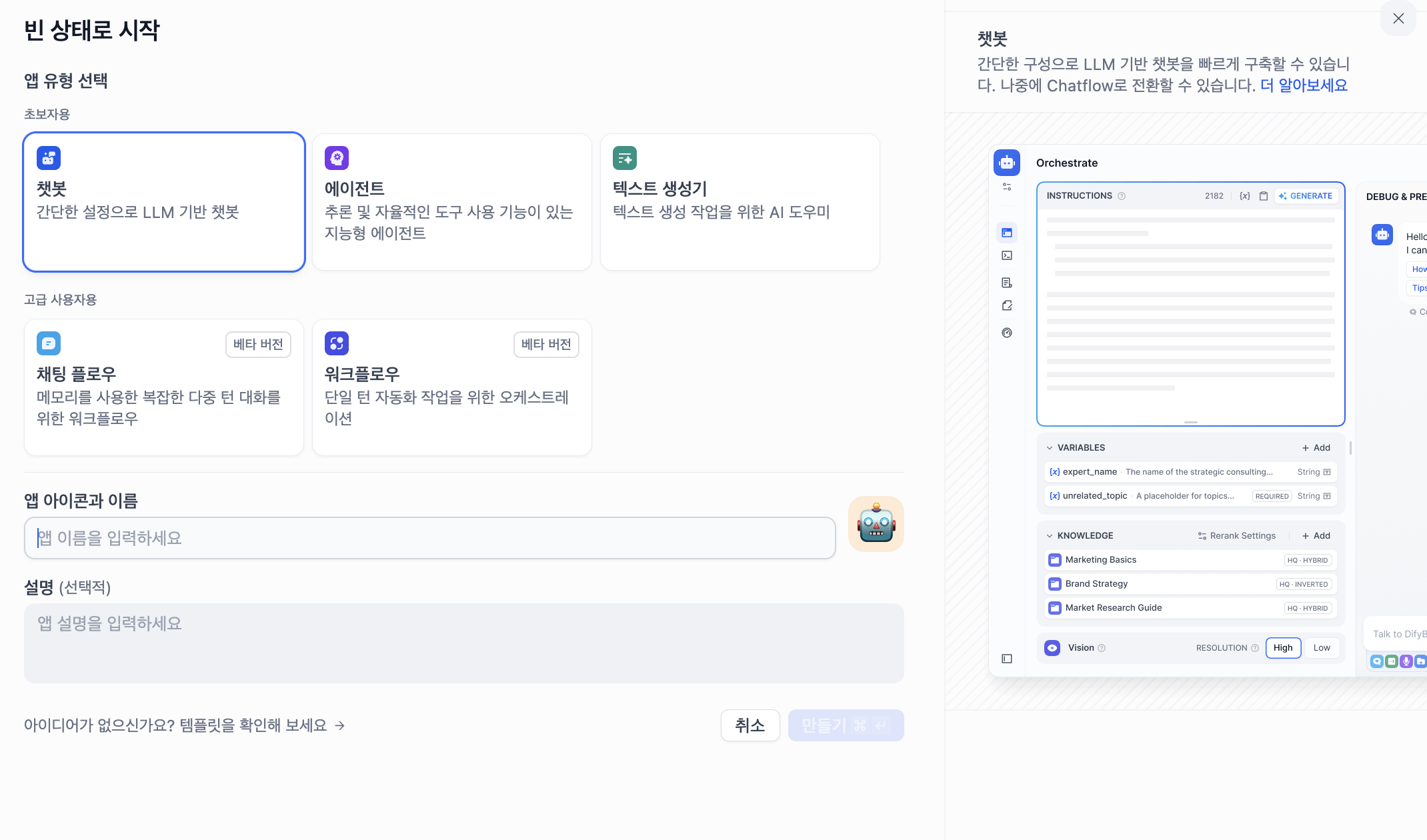앱 유형을 선택하고, 아이콘과 이름을 지정하고 나면 이제 본격적으로 LLM 어플리케이션을 구성할수 있다.