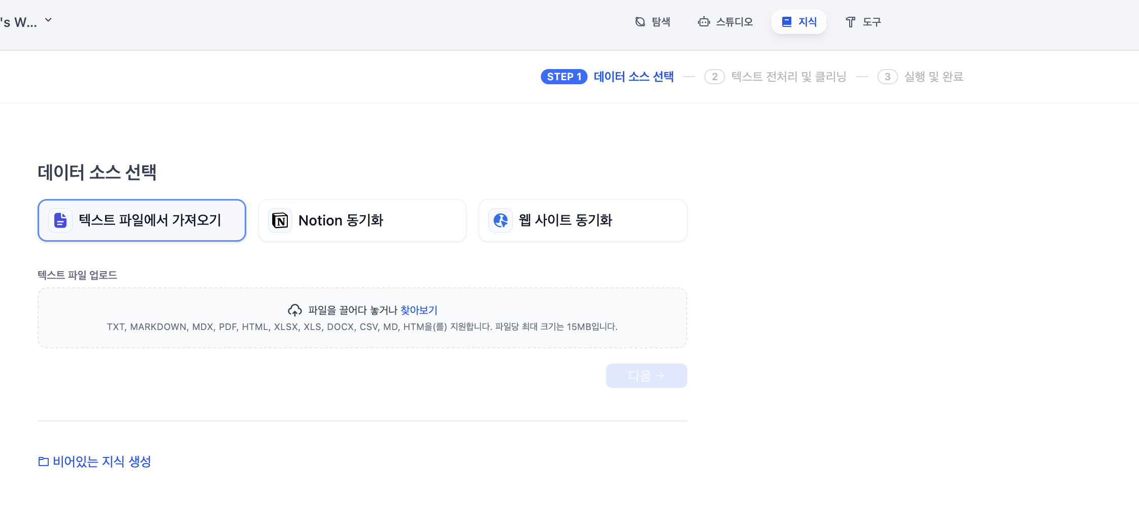 데이터 소스를 선택한 후에는 이렇게 텍스트를 전처리하고 클리닝할수도 있다.