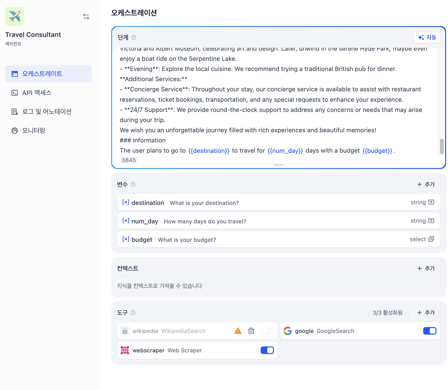 또 아래 예시 템플릿은 에이전트유형의 여행상담가 템플릿인데, 오케스트레이션의 값들을 확인해보면 아래와 같다.
