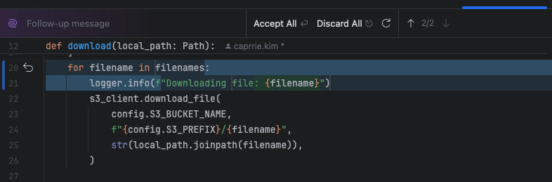 그러면 명령을 한대로 코드가 자동으로 바뀌고, 이걸 accept할지 discard할지 선택할수 있다.