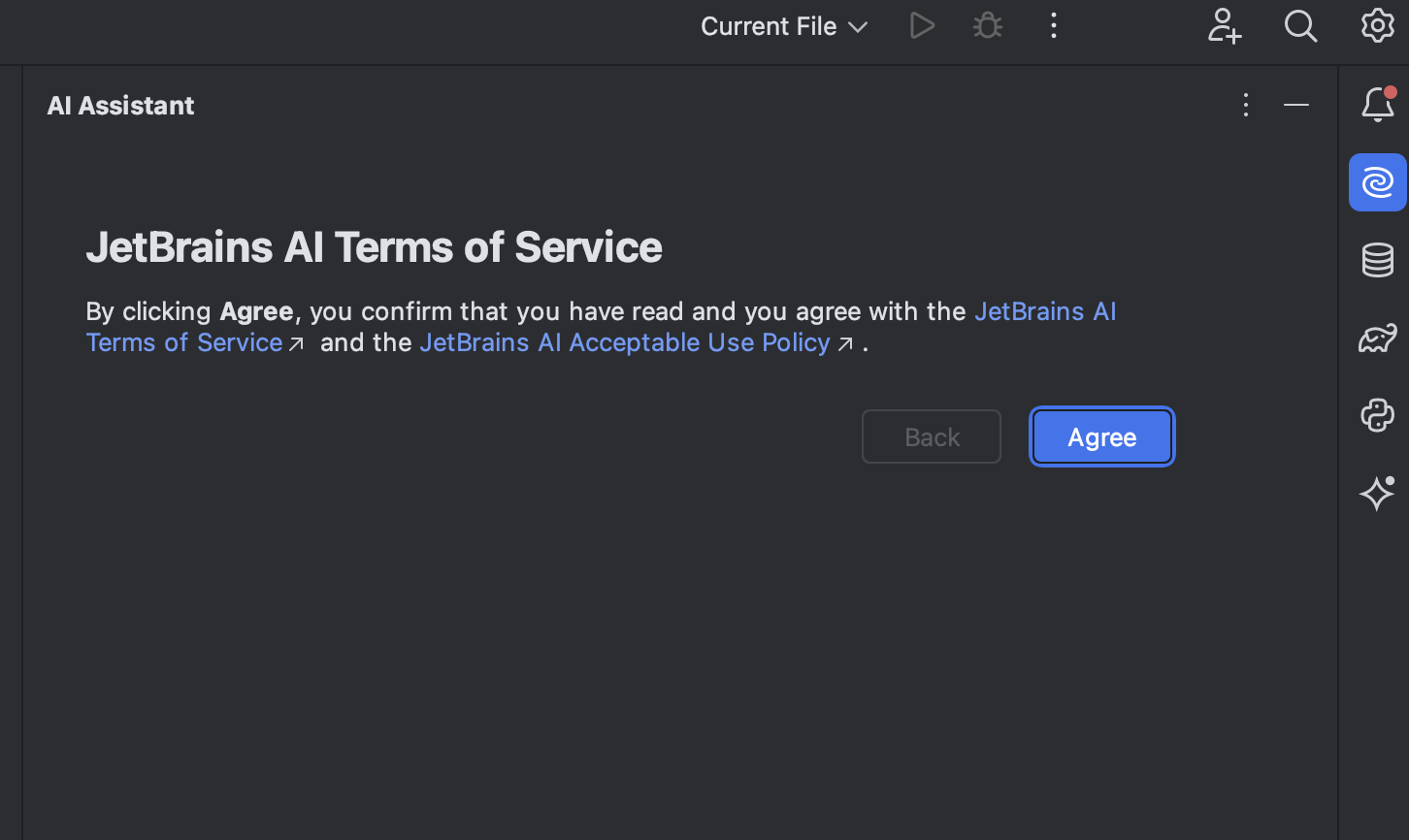 여기를 눌러서 AI Assistant를 활성화 시킬수 있다. 그리고 처음이니까 일단 Agree 눌러주면 된다.