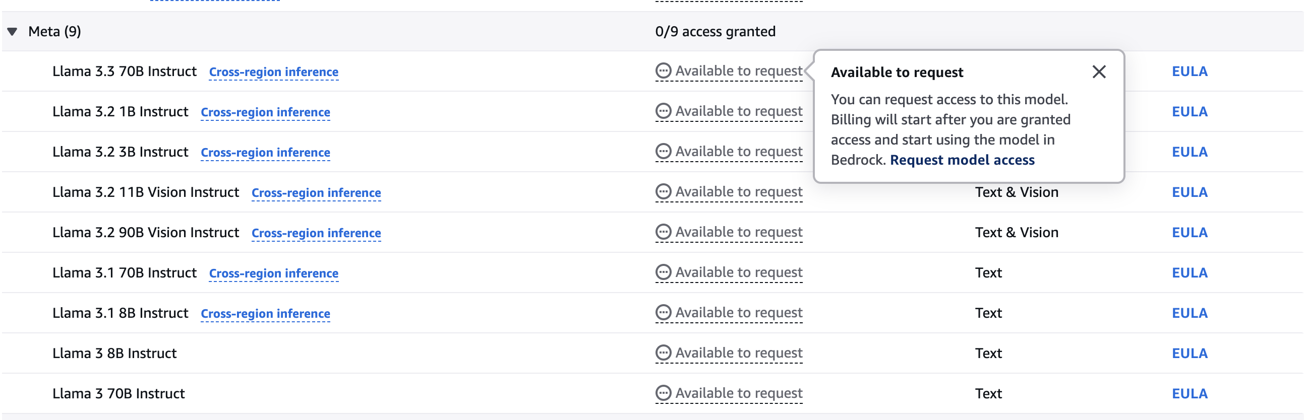 원하는 모델의 [Request model access]를 눌러서 모델에 대한 접근을 요청한다.