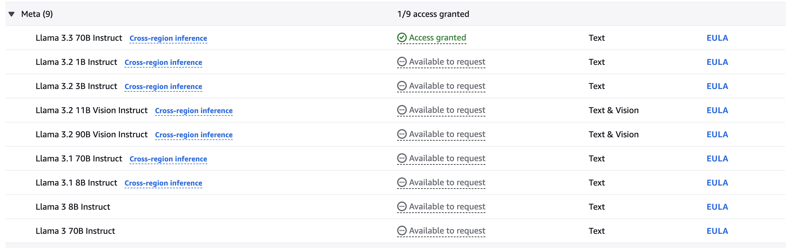 결론적으로 나는 고성능 저비용 모델로써 Llama 3.3 70B 모델을 사용하기로 했다. 최신모델이라 버지니아 리전에서 쓸 예정이다.