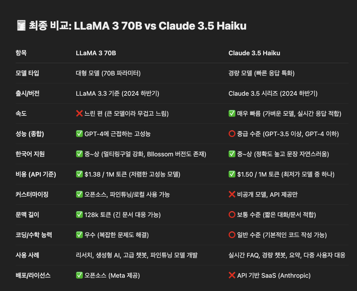 가장 고민이 되었던 Claude 3.5 Haiku와 LLaMA 3 를 비교한 끝에....