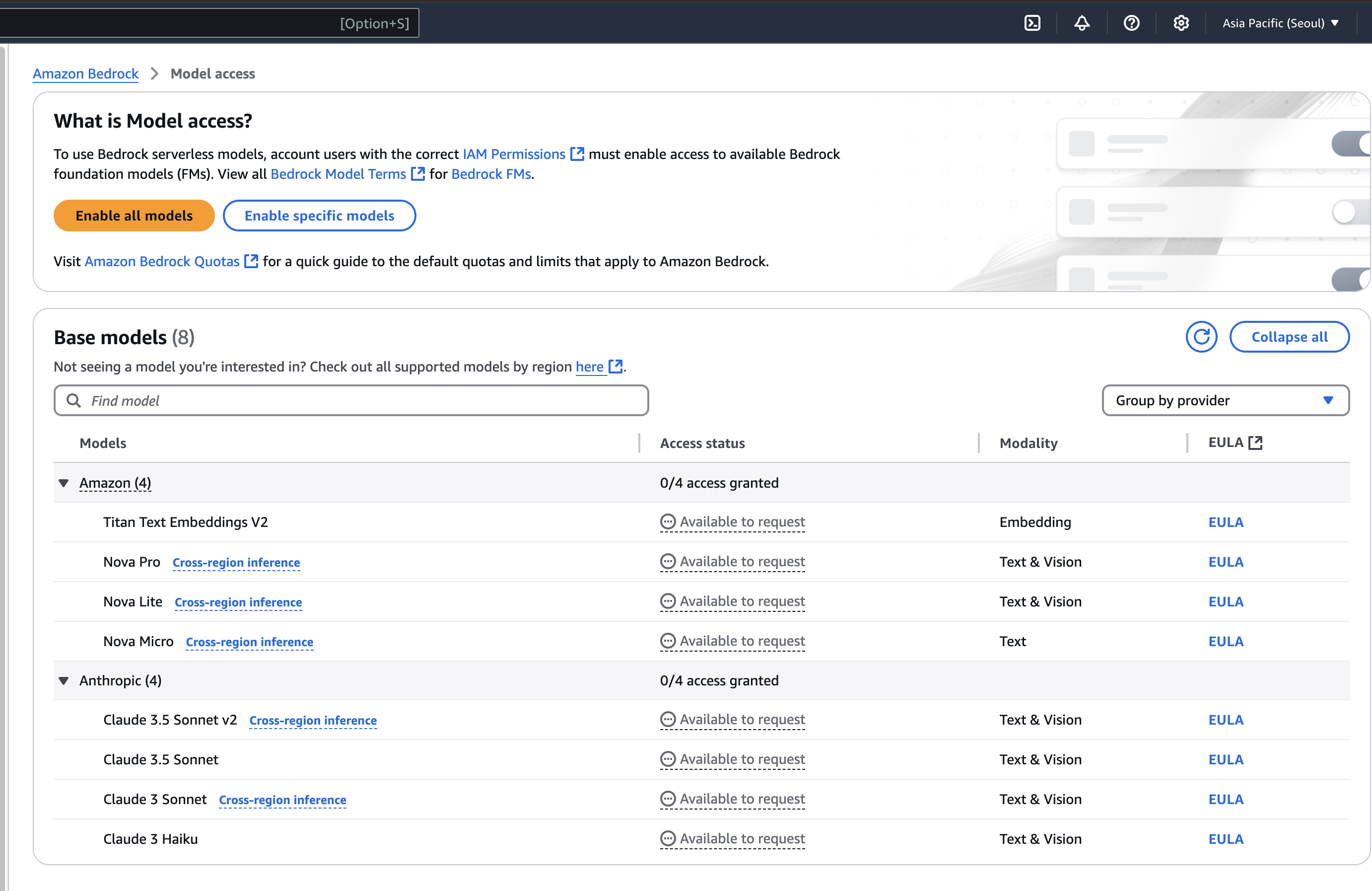 그러면 이제 Bedrock에서 사용할수 있는 모델들을 확인할수 있게 된다.