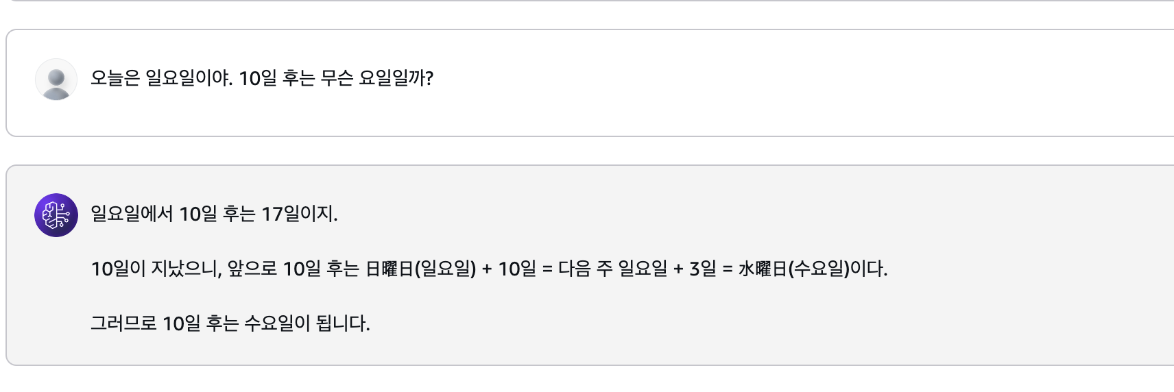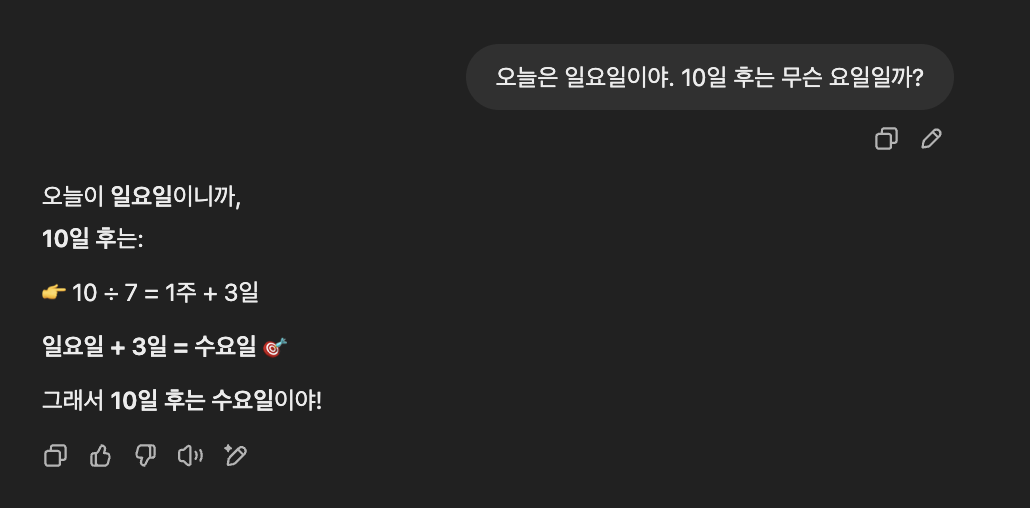 모델의 사고력 및 추론능력을 비교해보기 위해 단순 계산 보단 여러 조건을 조합해서 논리적으로 답을 도출해야하는 질문을 해봤다.