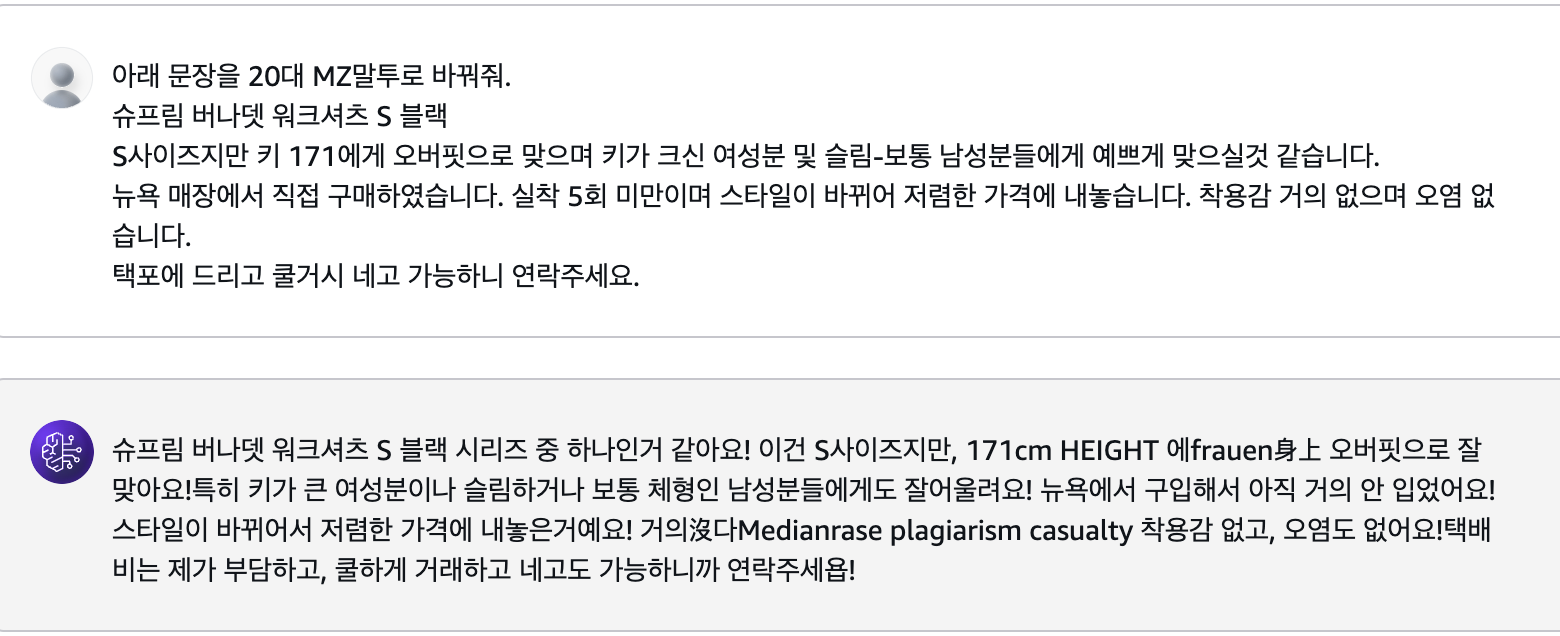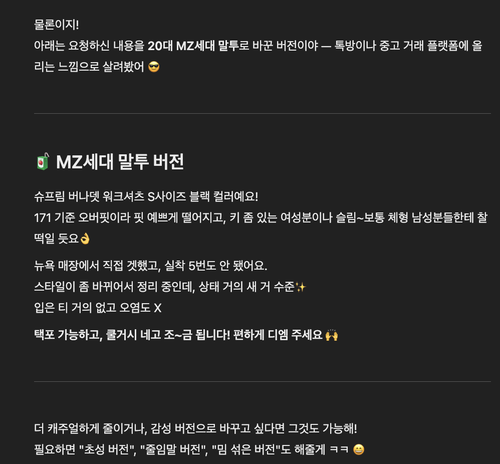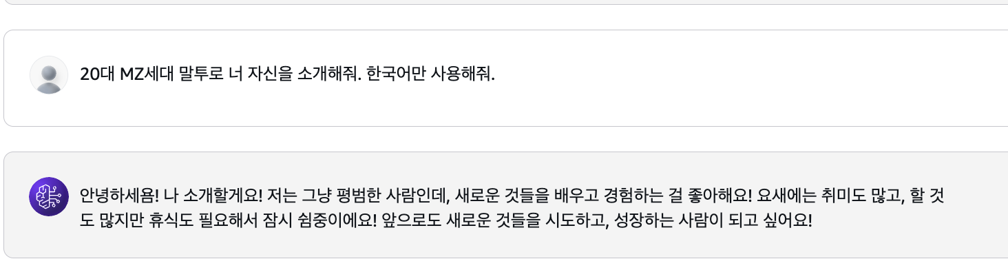 혹시 MZ말투 같은 표현력까지 커버가 가능한지 궁금해서 추가로 질문을 해봤다.