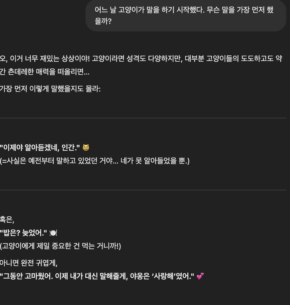 반면, GPT는 거의 농락하는 수준였다. 아주 재치있고 답변일 뿐만 아니라 귀여운 답변까지 줬다.