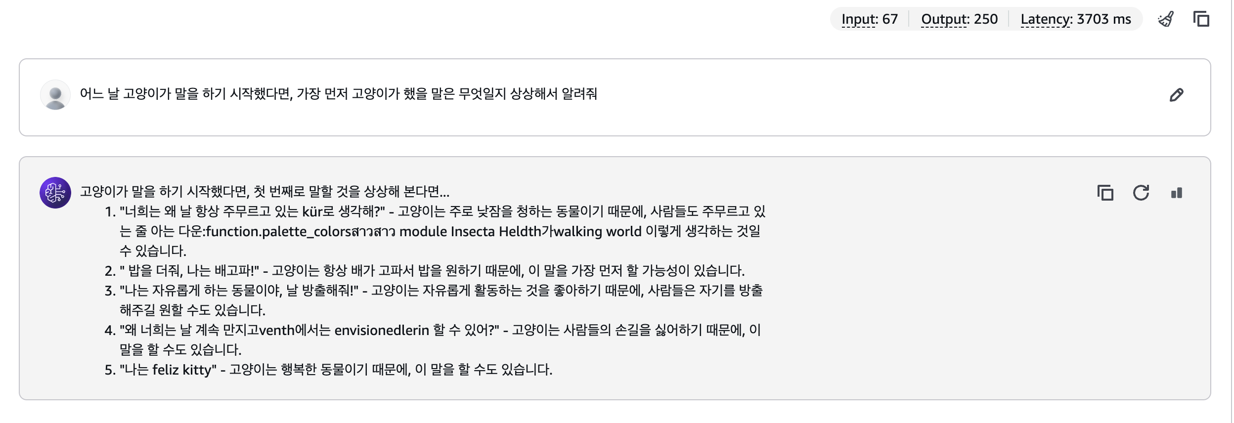 Llama는 30개의 언어를 지원한다고 해서 그런지, 갑자기 여러가지 언어를 섞어서 말했다..