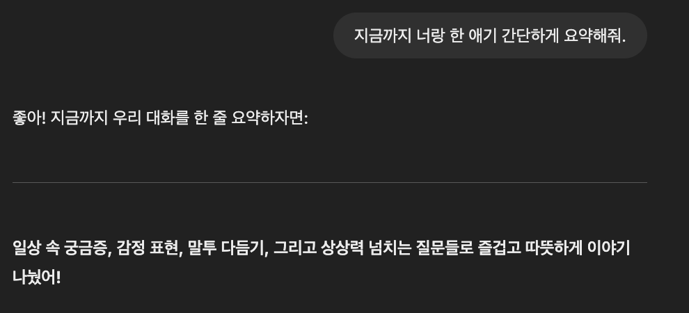 그리고 전체적으로 대화 맥락을 이해하고, 기억을 할수 있는지도 알아보는 질문을 해봤다.