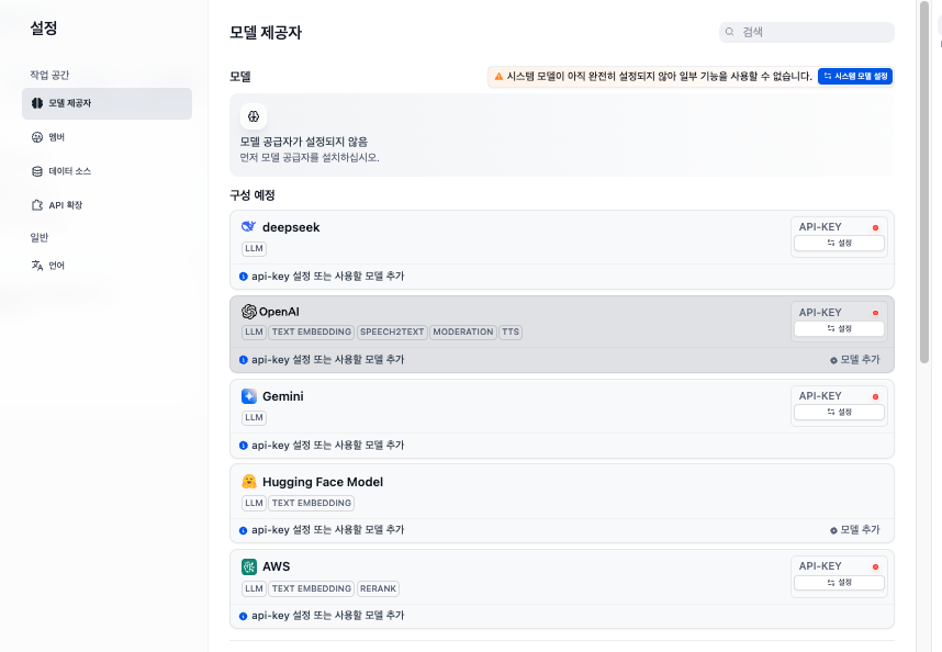 이제 본격적으로 dify사용하기 위해 이제 모델 key를 등록해보려고 한다.