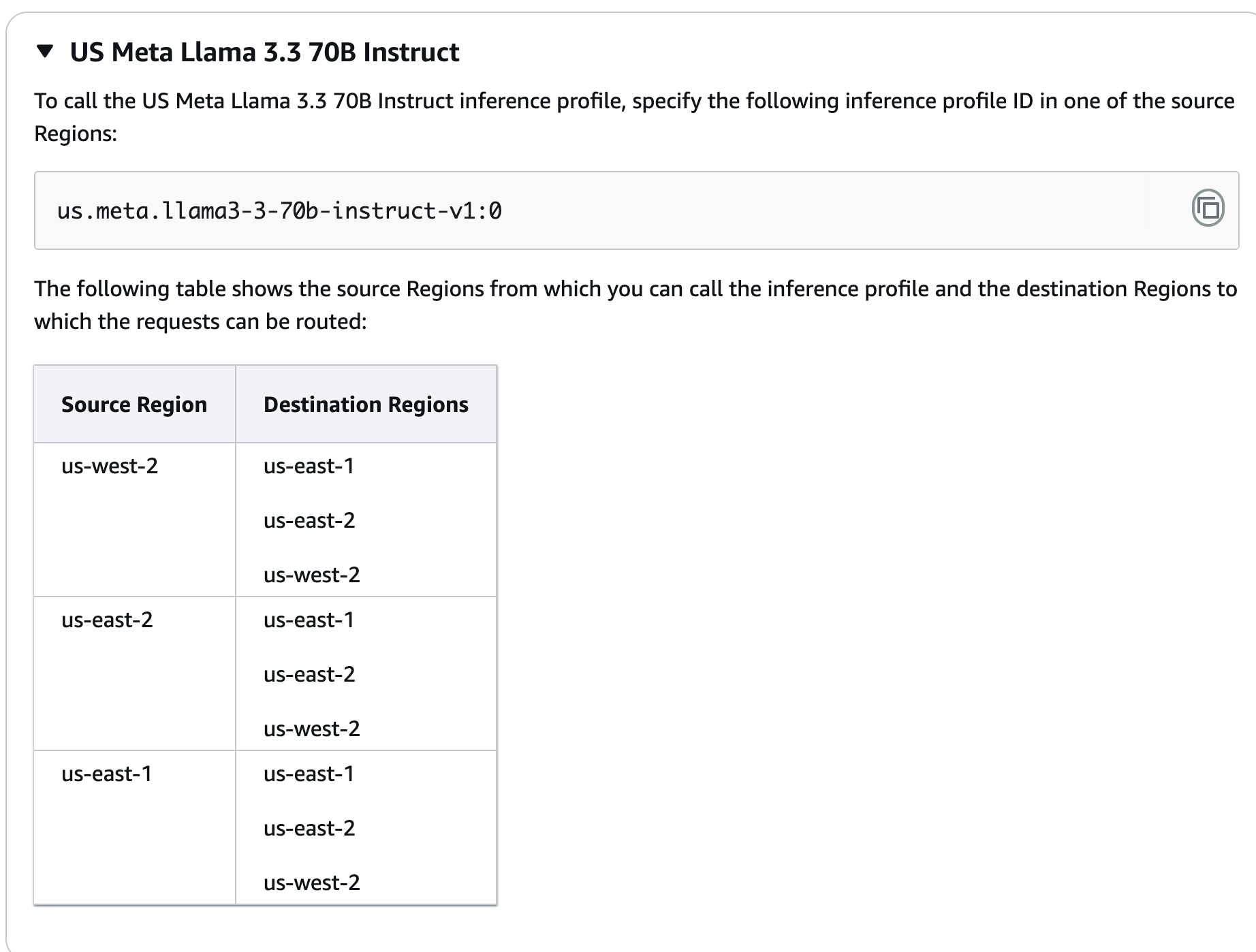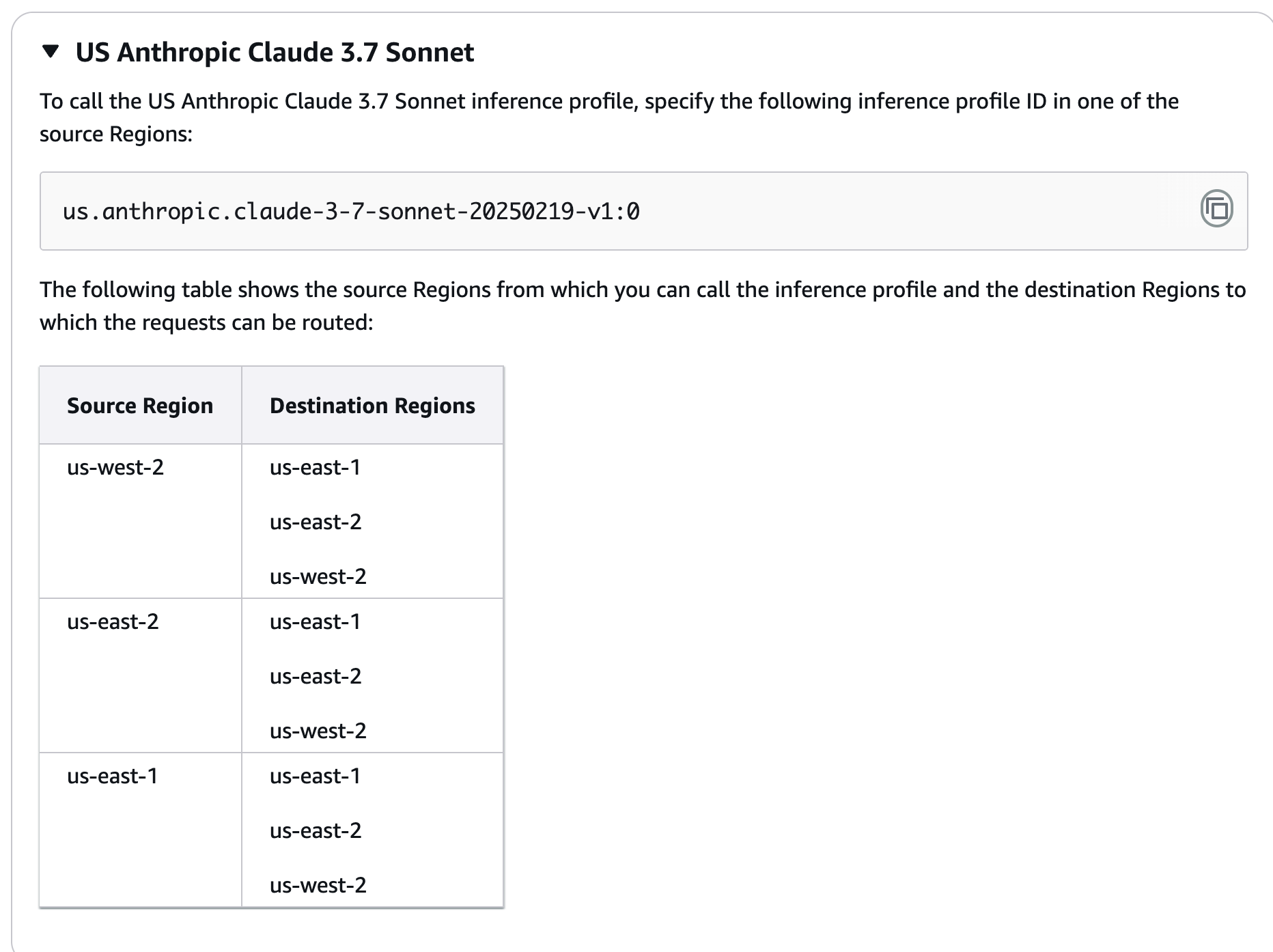 Some inference profiles route to different destination Regions depending on the source Region from which you call it. For example, if you call us.anthropic.claude-3-haiku-20240307-v1:0 from US East (Ohio), it can route requests to us-east-1, us-east-2, or