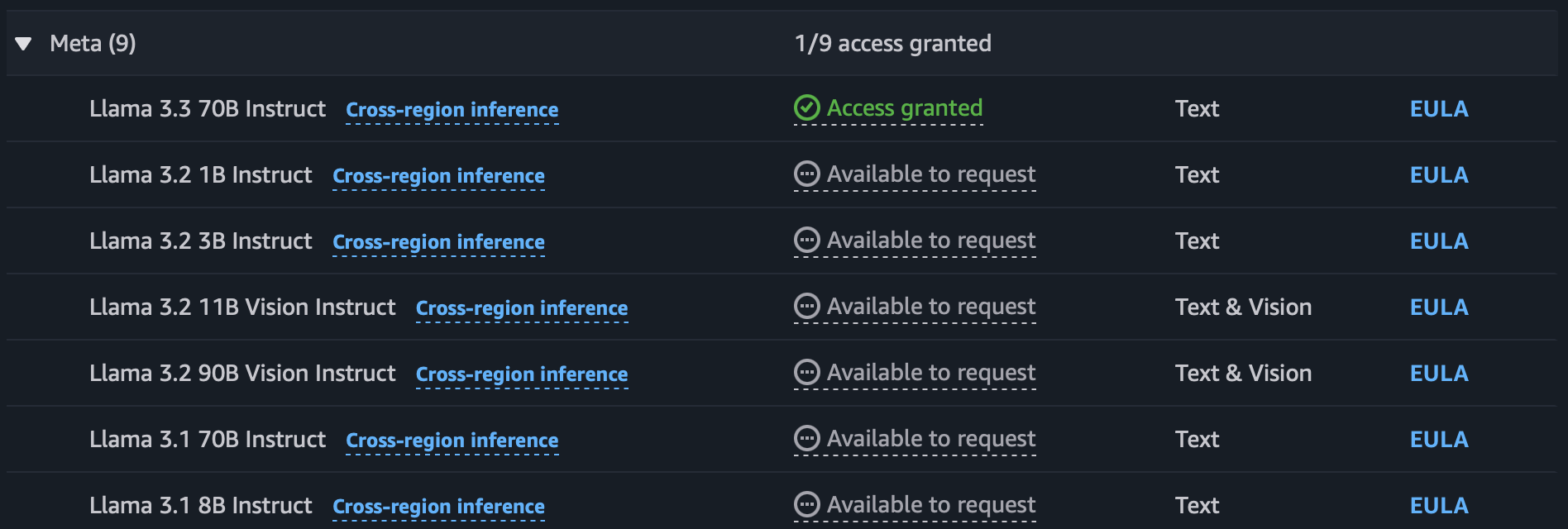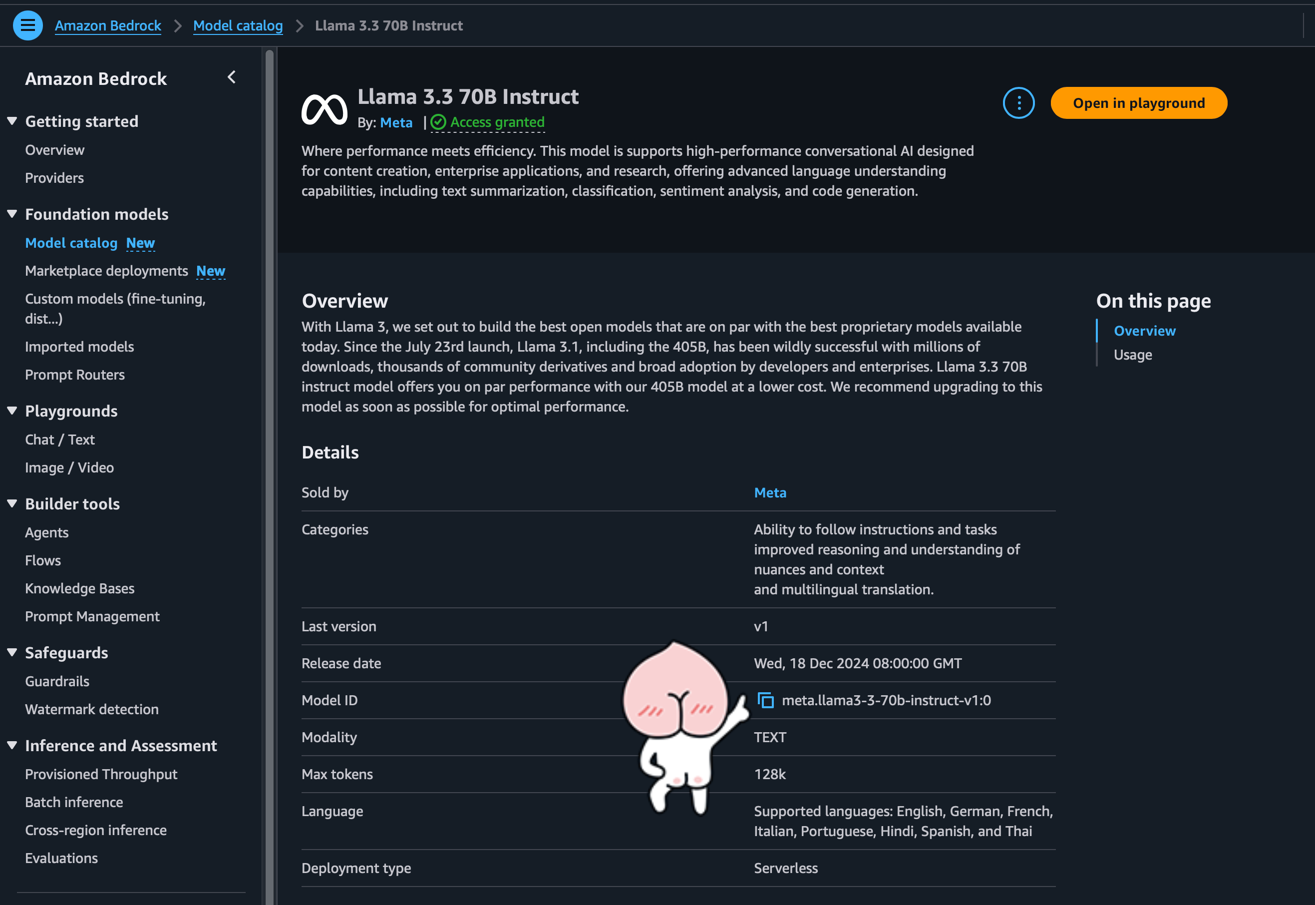 [Model Access]에서 확인한 모델 이름으로.. <Llama 3.3 70B Instruct> 요렇게... 작성했더니 아니였다..