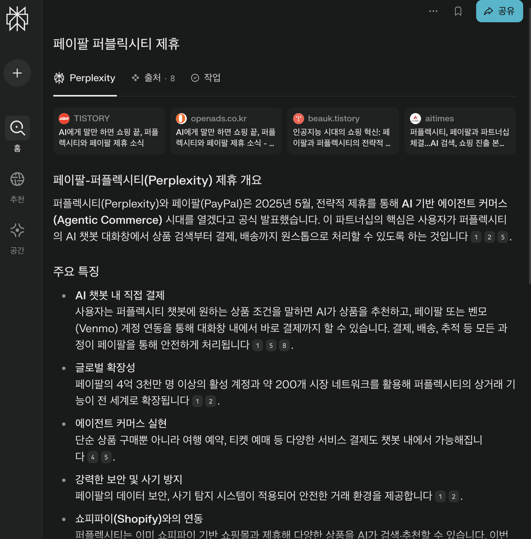 퍼플렉시티(Perplexity)가 페이팔(PayPal)과 전략적 제휴를 맺고 에이전트 커머스(Agentic Commerce) 시대를 연다고 발표했습니다. 이제는 AI에서 원하는 상품의 조건을 말하고, AI가 직접 비교해 온 상품을