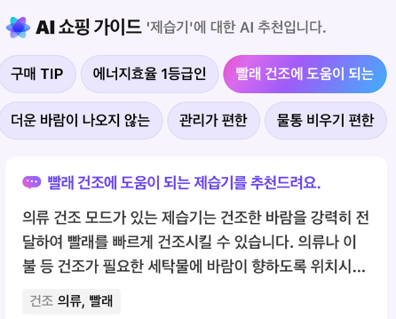 몇가지 질의어를 제안해준다. 덕분에 사용자는 제습기를 구매할때 자신도 모르고 있었던 니즈를 찾을수 있게 된다.