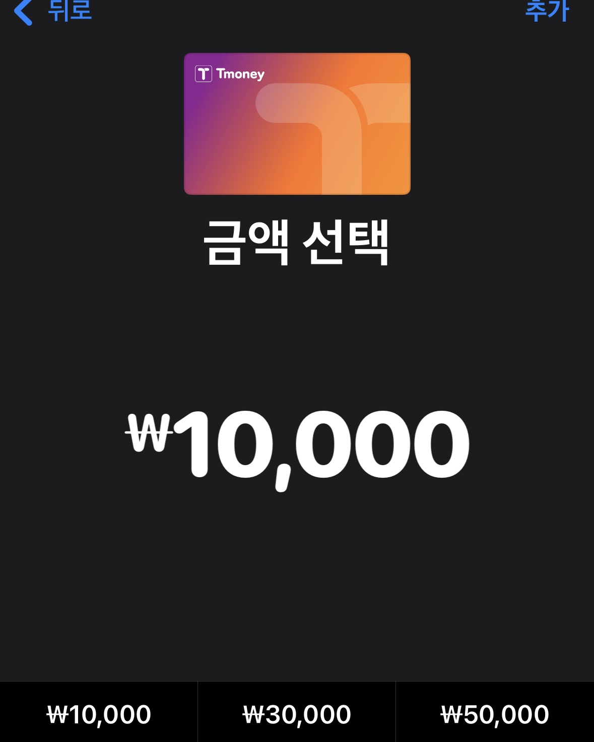 그래서 나는 우선 만원을 충전해서 티머니 교통카드를 아이폰에 이렇게 등록했다.