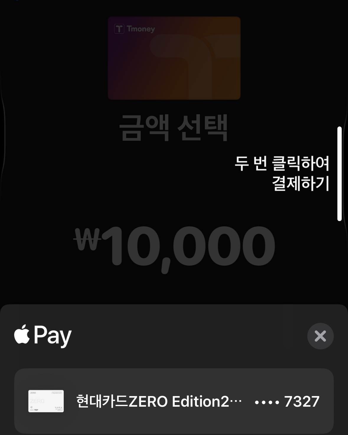 이미 애플페이로 현대카드가 등록이 되어 있다면 진짜 단숨에 충전이 된다.