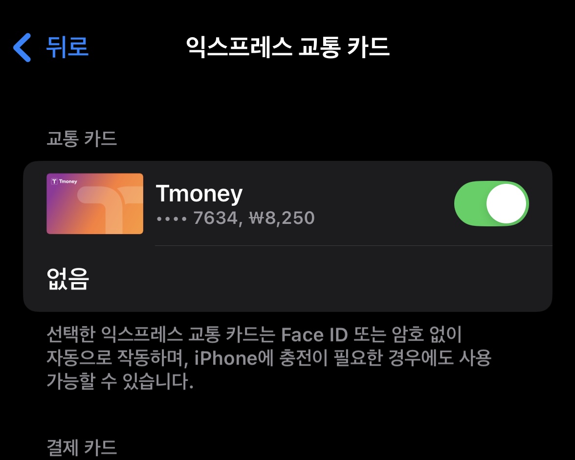 그래서 아이폰 교통카드로 티머니를 등록하고 아래와 같이 익스프레스 모드 설정이 켜져있는지 확인하면 좋을것 같다.