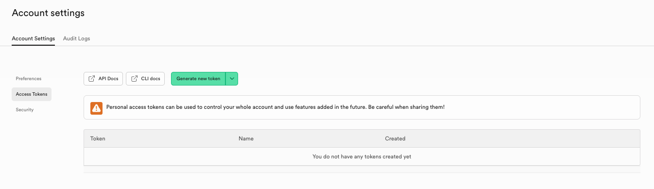 supbase 대시보드> 우측상단 프로필 아이콘 > Account setting 탭 > 요기 초록색 버튼 > 토큰 생성
