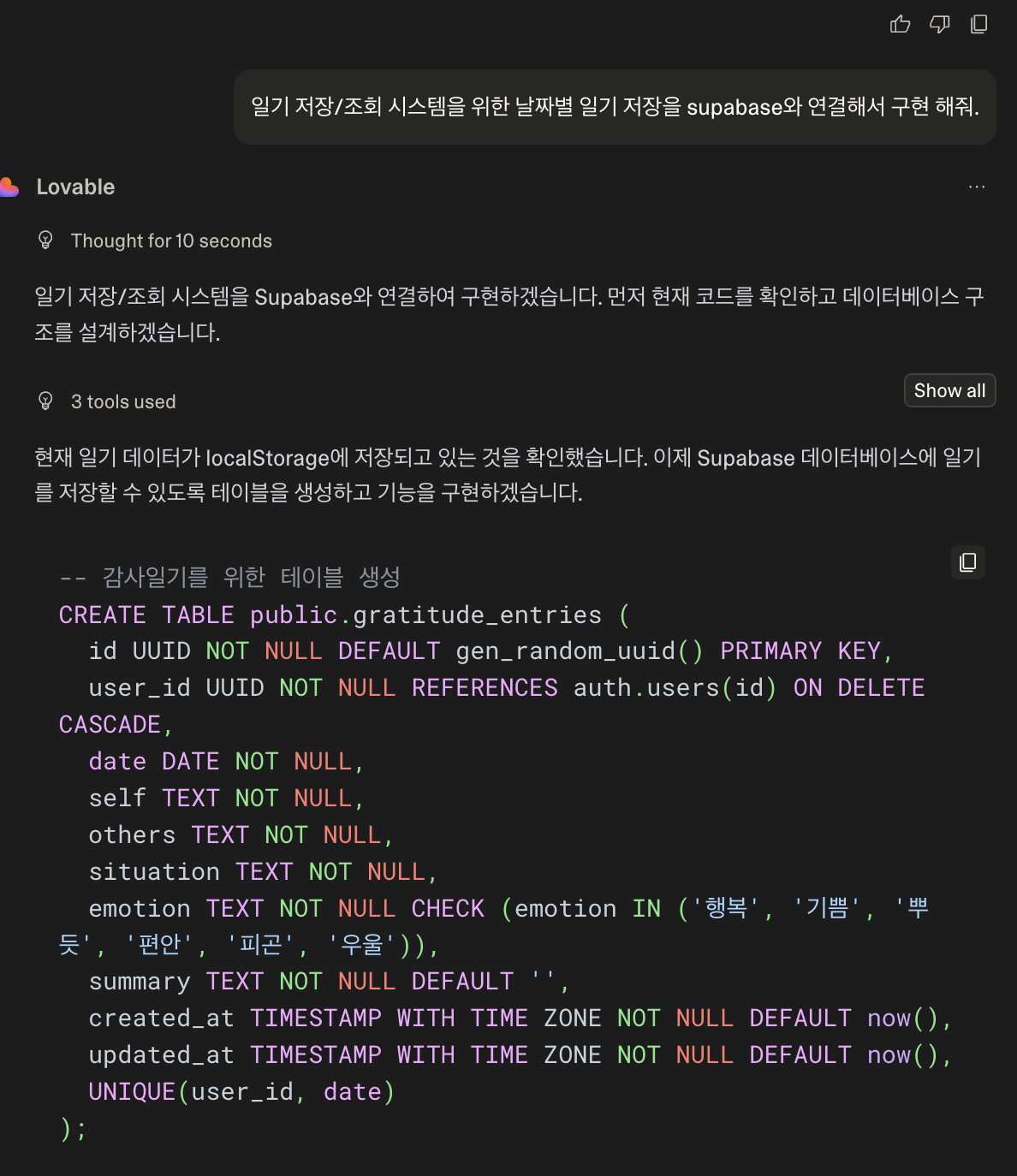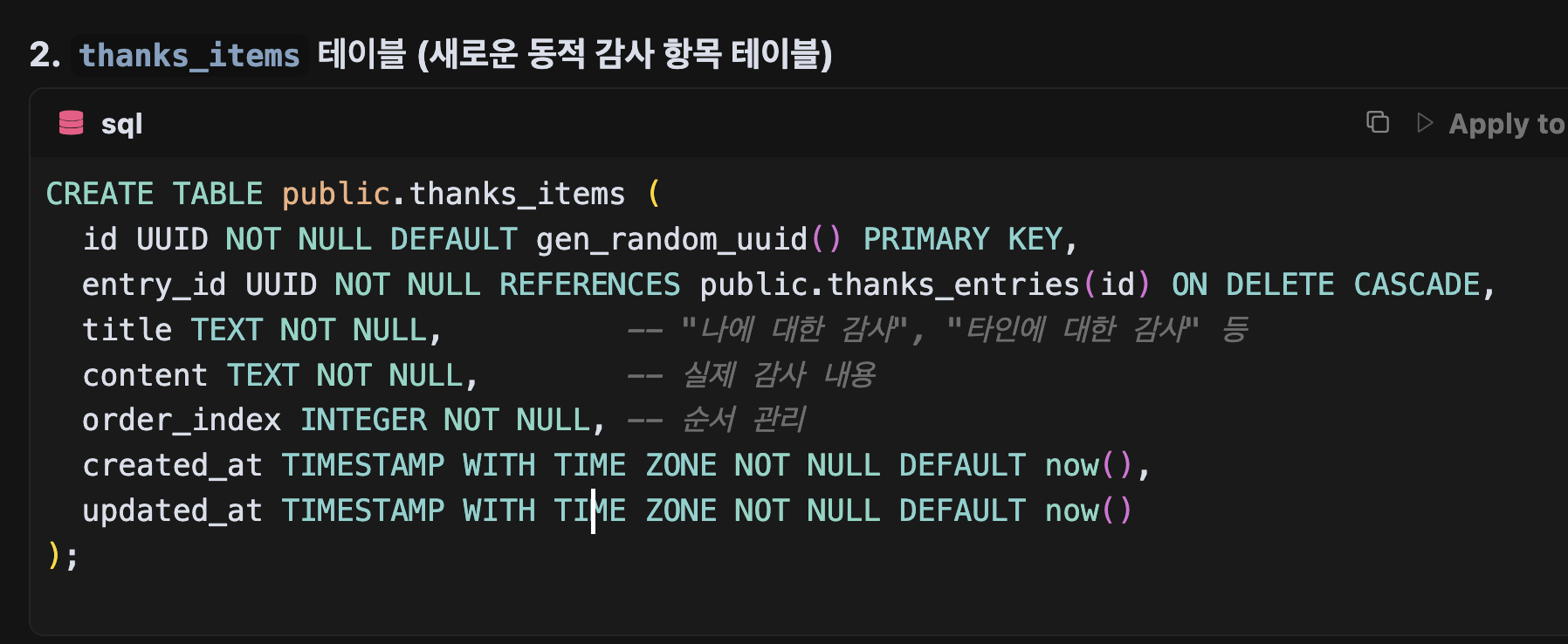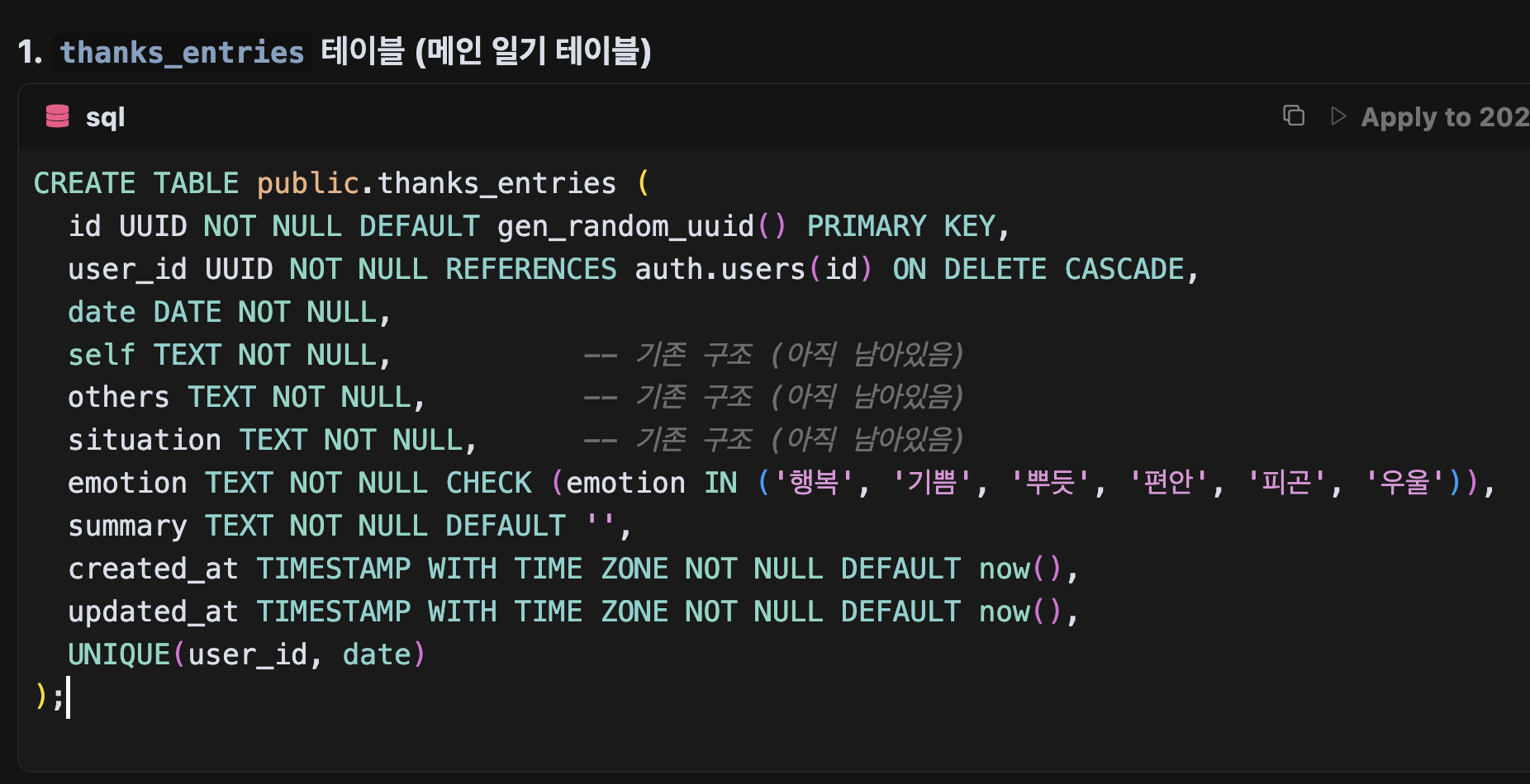 커머AI 한테 테이블 이름을 gratitude_entries 에서 thanks_entries로 바꾸고 싶다고했다. 백엔드의 디테일 작업을 수행해주었다.