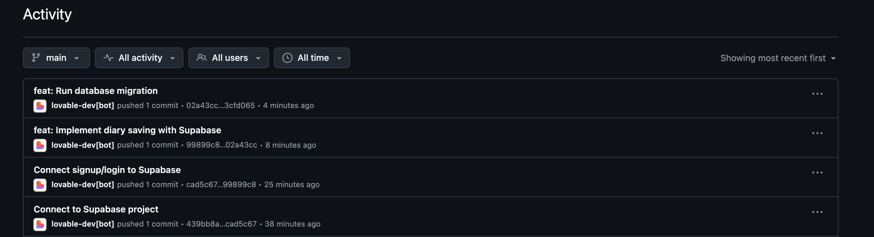 이미 lovable을 나의 깃허브랑 연동시켜놨기 때문에, 이렇게 lovable에서 작업한 내용들이 lovable-dev[bot]에 의해 자동 커밋이 된다!!