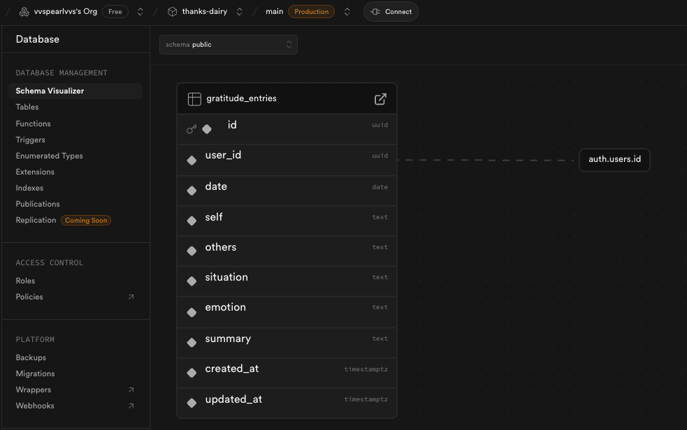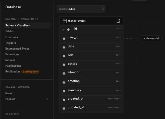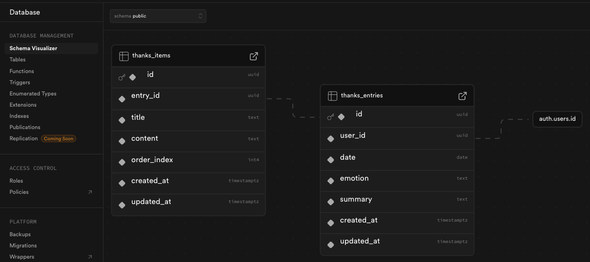 최종적으로 이렇게 테이블이 생성된걸 확인할수 있다. gratitude_entries 에서 thanks_entries로 테이블명이 바뀌었다.