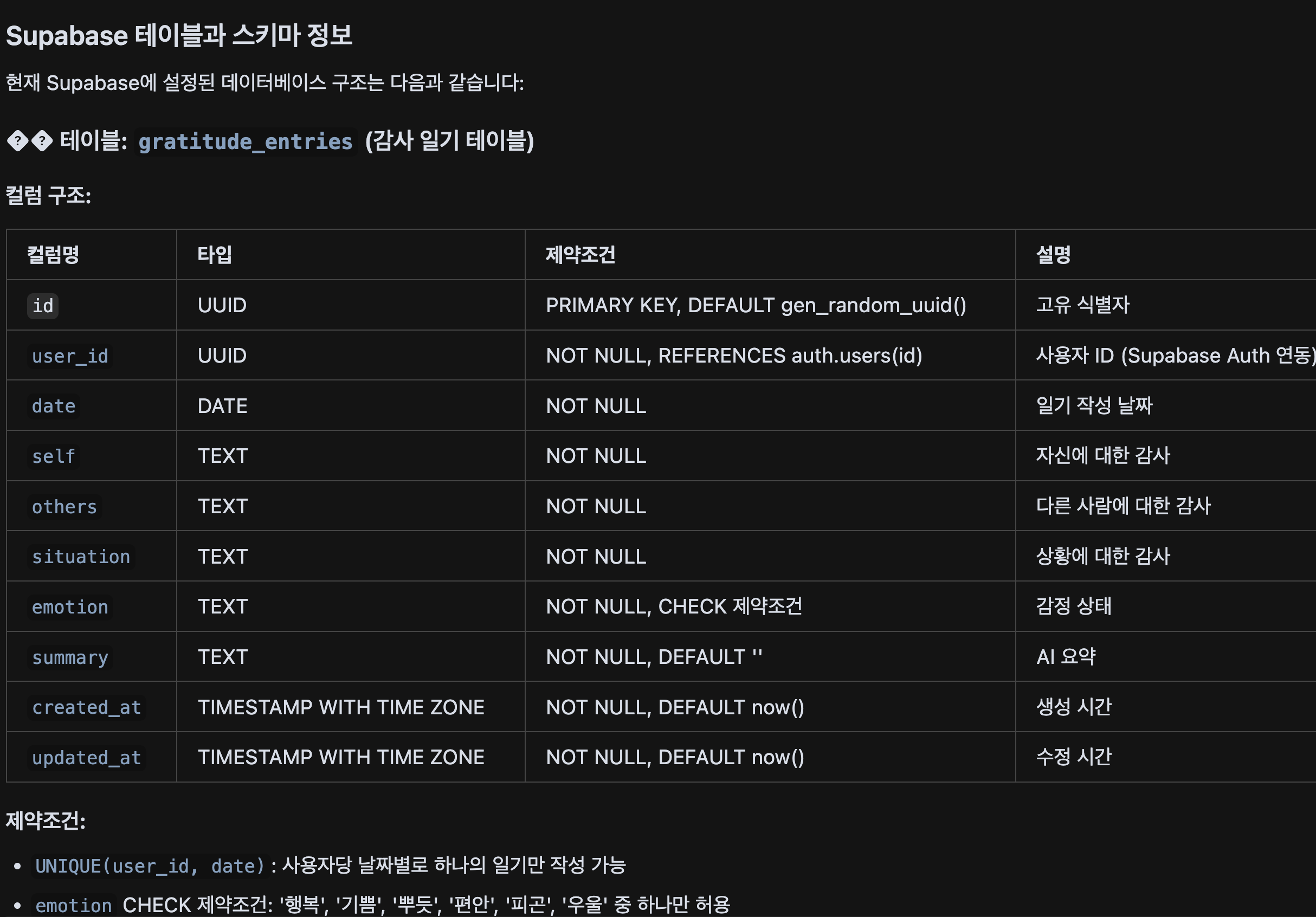 특히 백엔드는 supabase라는 오픈소스 데이터베이스를 사용해서 일기를 저장하고 조회하는 시스템까지 추가했다.