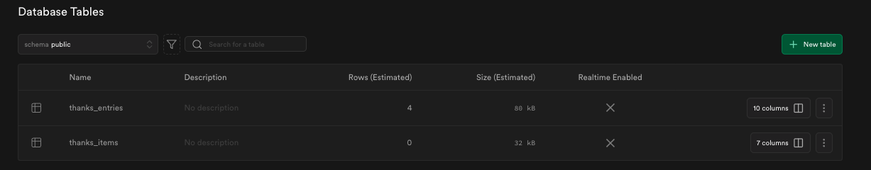 supabase에 직접 들어가서 확인해보면, 테이블에 대한 스키마 정보를 요런식으로 확인할수 있다.