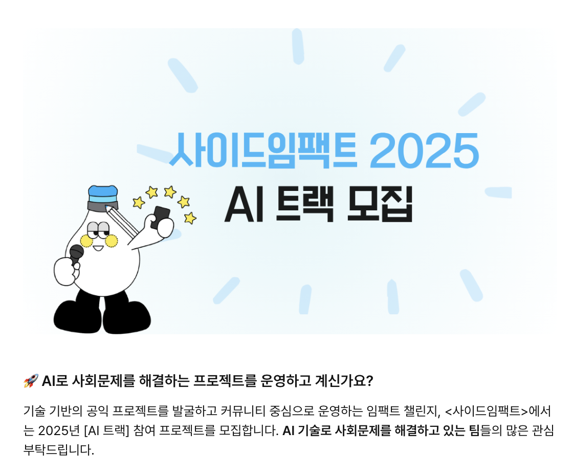AI를 통한 사회문제 해결에 관심이 많은 일반인,대학생 분들까지 사이드 임팩트 활동을 추천드리며 많은 관심과 지원 부탁드립니다!