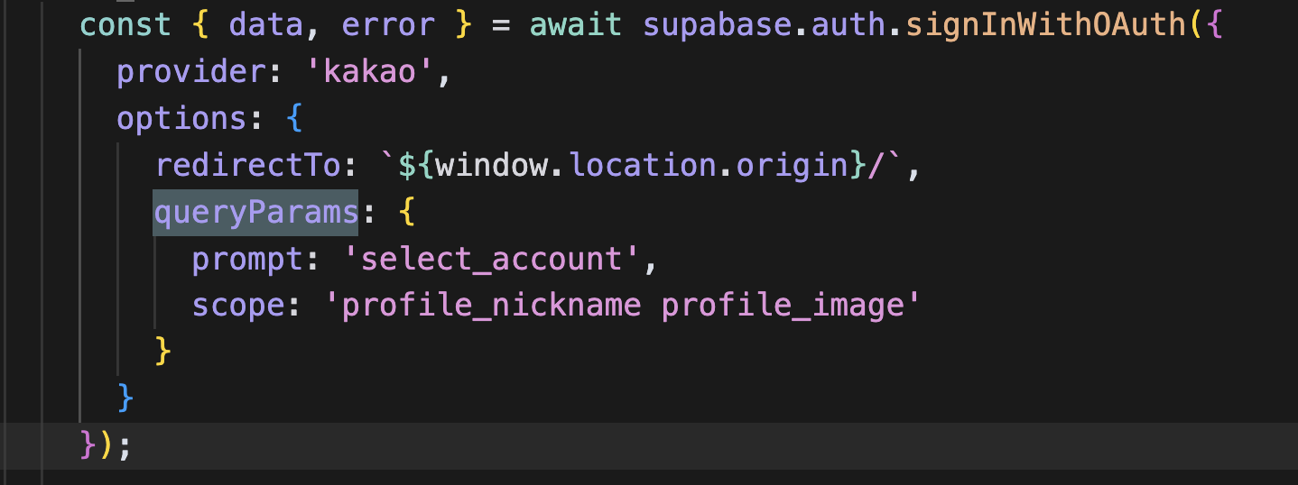 실제로 코드에서 로그인 요청을 할때 이렇게 scope 파라미터에 profile_nickname profile_image 요렇게 넣는다.