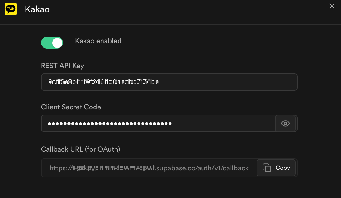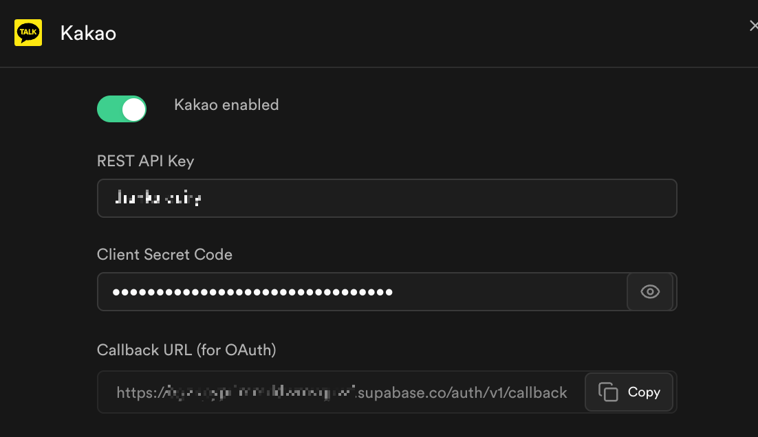 3. RESTAPI KEY 등록 : 카카오의 REST API 키를 -> Supabase의 REST API 키에 등록