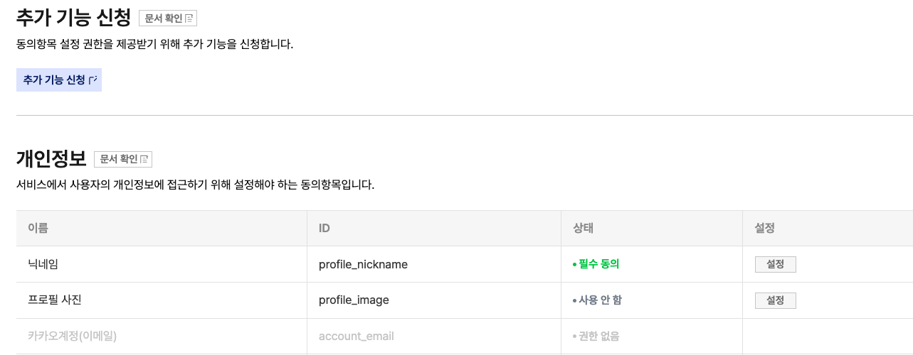 카카오 로그인 기능을 위해선 카카오로부터 카카오계정(이메일)을 제공받아야하는데, 카카오측에 따로 추가 동의항목을 신청해야한다.
