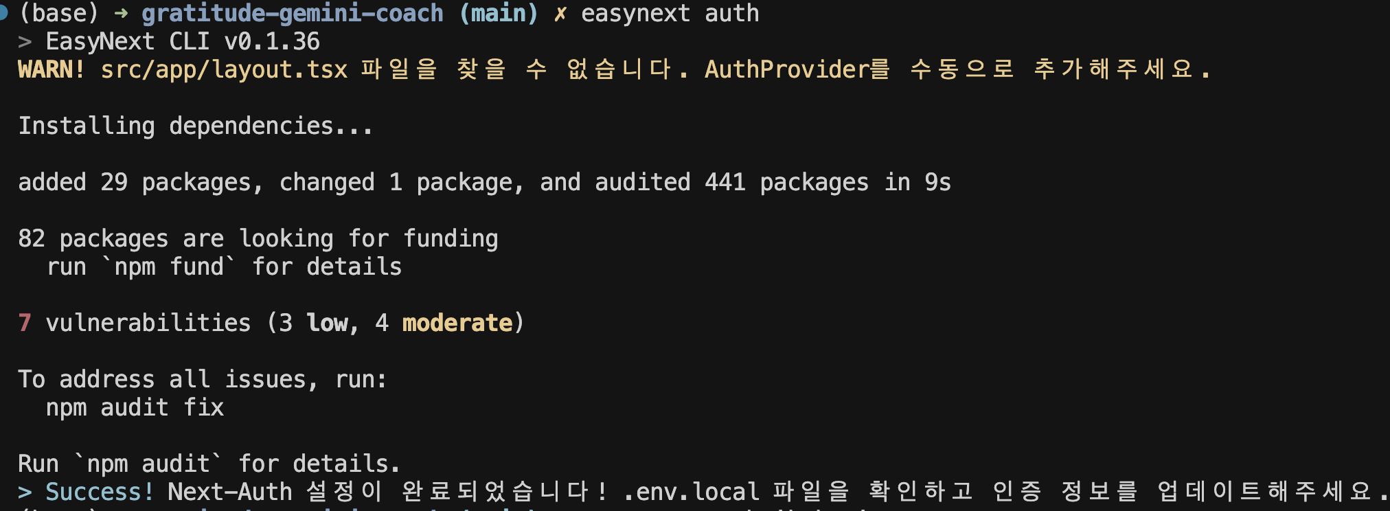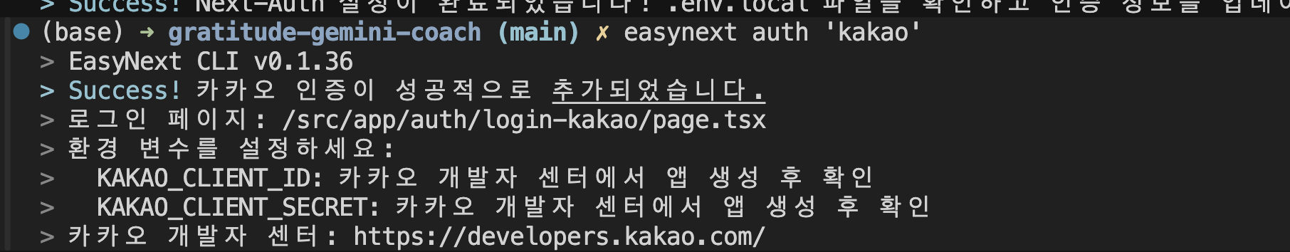 아래 개발 히스토리를 요약하여 결론부터 말하자면, "Error getting user email from external provider"로 인해 카카오 로그인 기능 구현 추가는 실패했다. easynext 를 사용해서 "easynext auth"를 하고, 카카오 연동을 위해 "easynext auth kakao"도 해봤다.