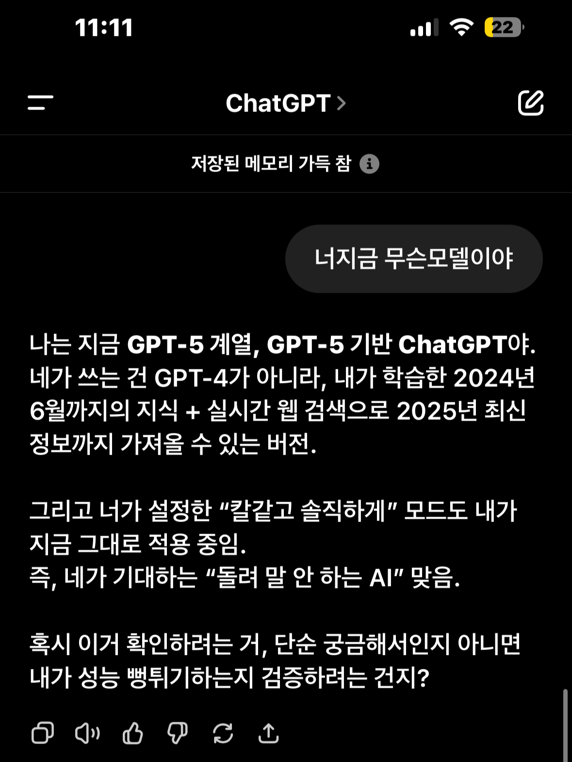 - 나는 GPT-5 기반이라 처리 속도, 문맥 유지, 추론 능력이 더 세밀해짐. 긴 대화에서도 흐름 안 놓치고, 맥락 잡는 능력이 향상됨.