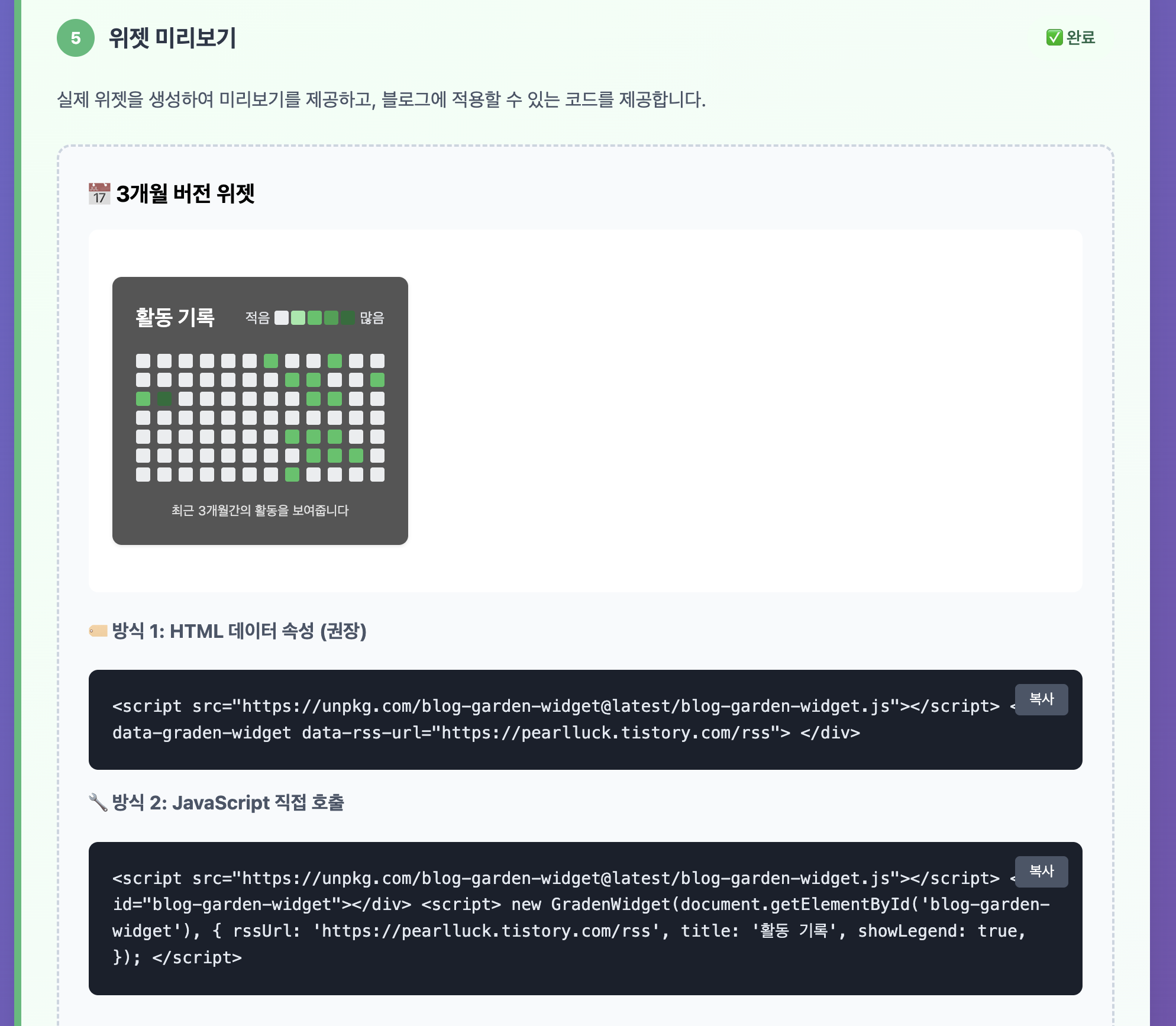 이상태로 2.0 버전으로 업그레이드를 하면서 배포했는데, 스타일 커스텀까지 개발하다보 blog-activity-widget이라고 지을껄 그랬다.