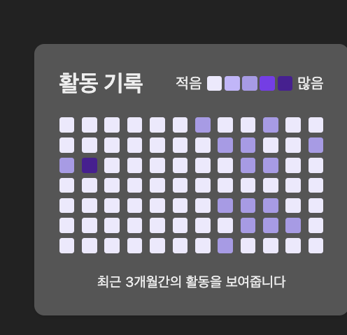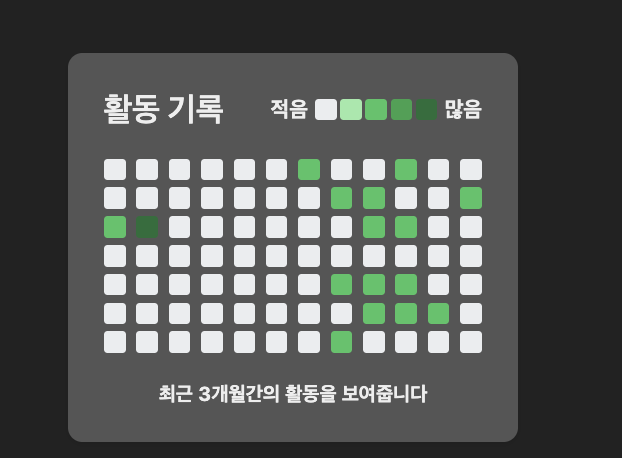 기본적으로 깃허브의 GitHub contribution graph 컬러맵을 그대로 가지고 오면서 5가지 단계에 따라 색이 구분이 된다.