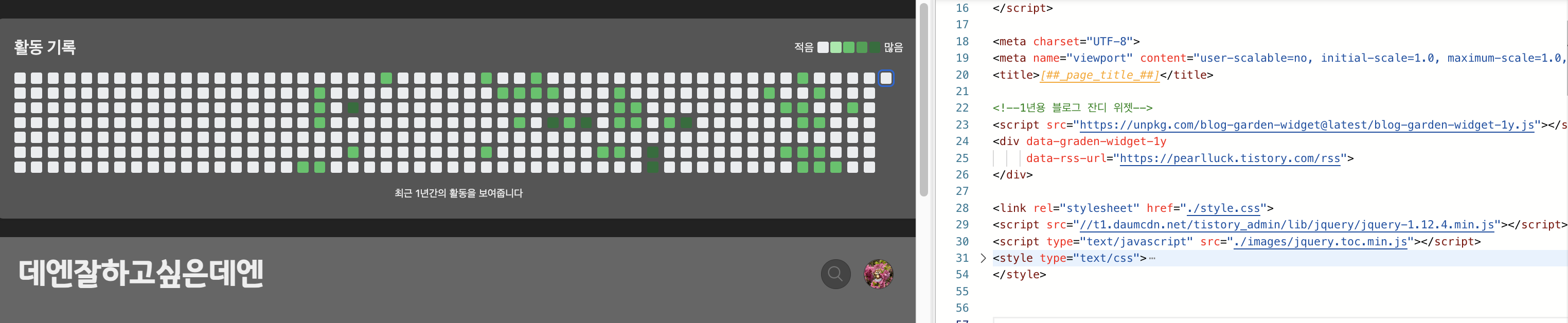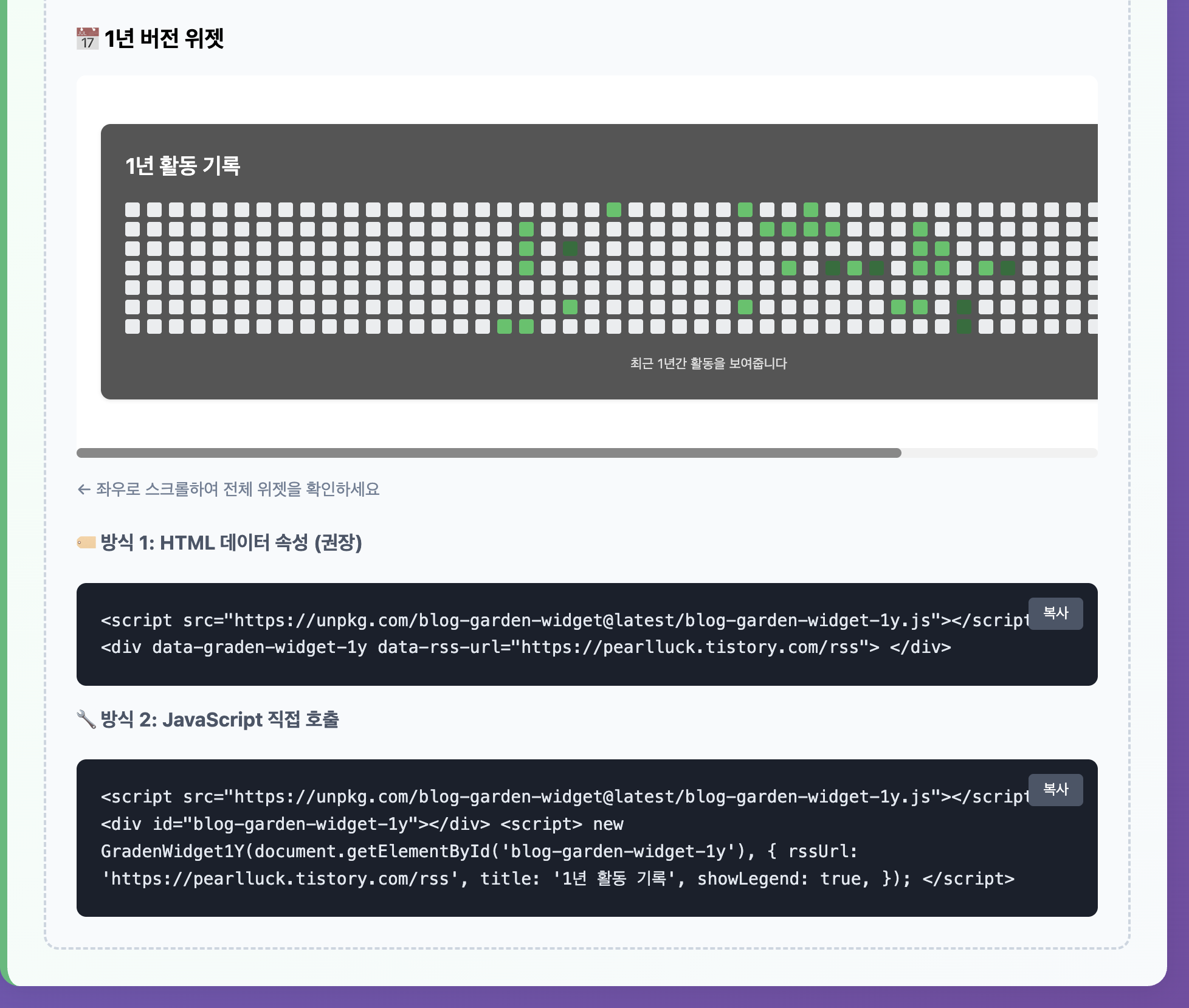블로그에 이 위젯을 직접 넣어서 게시글 수를 잔디형식으로 시각화해서 사용 할 수 있다.