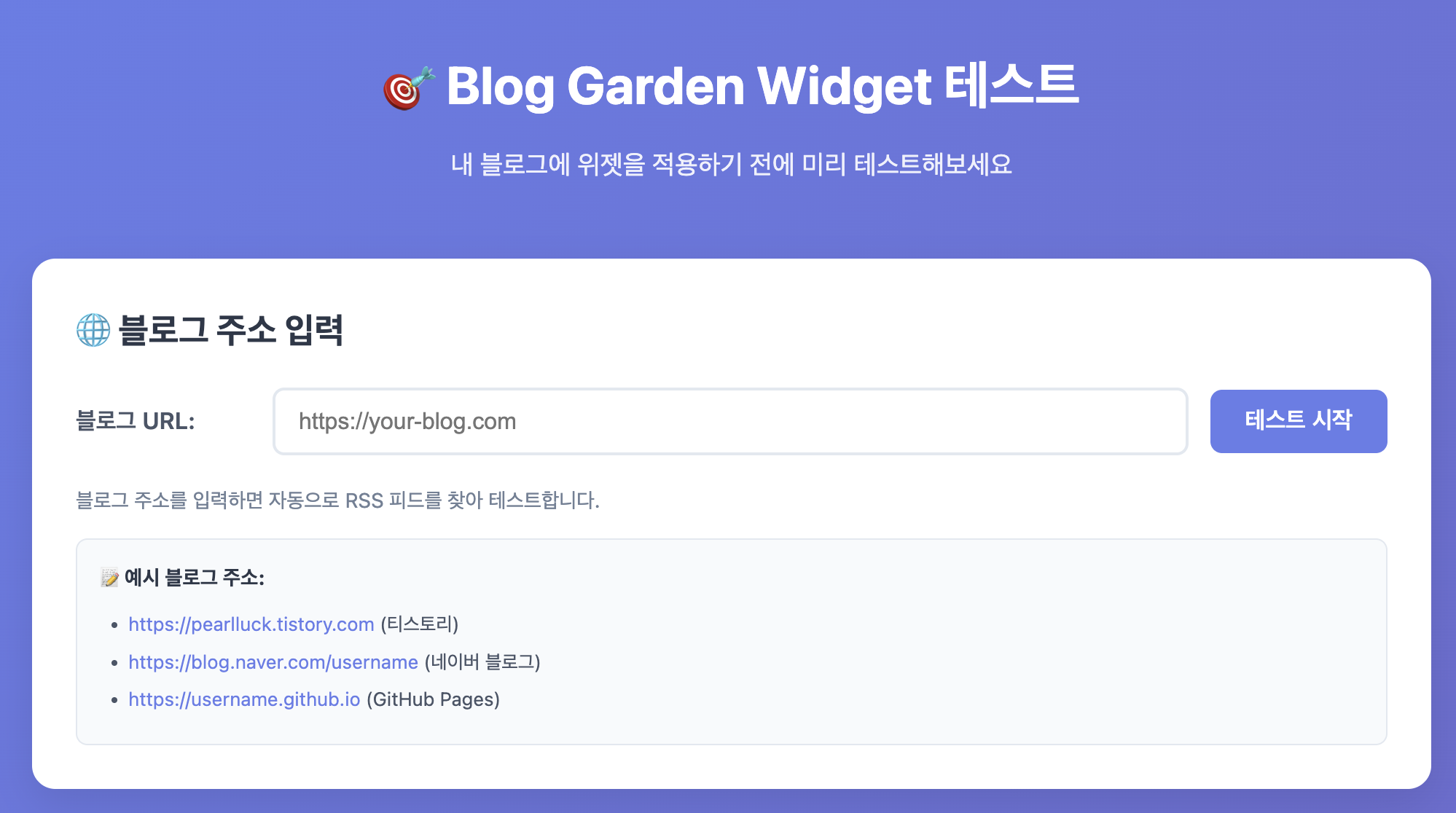 위 개발 방식에 따라 자신의 블로그 주소를 가지고 테스트해볼수 있는 페이지를 개발했다.