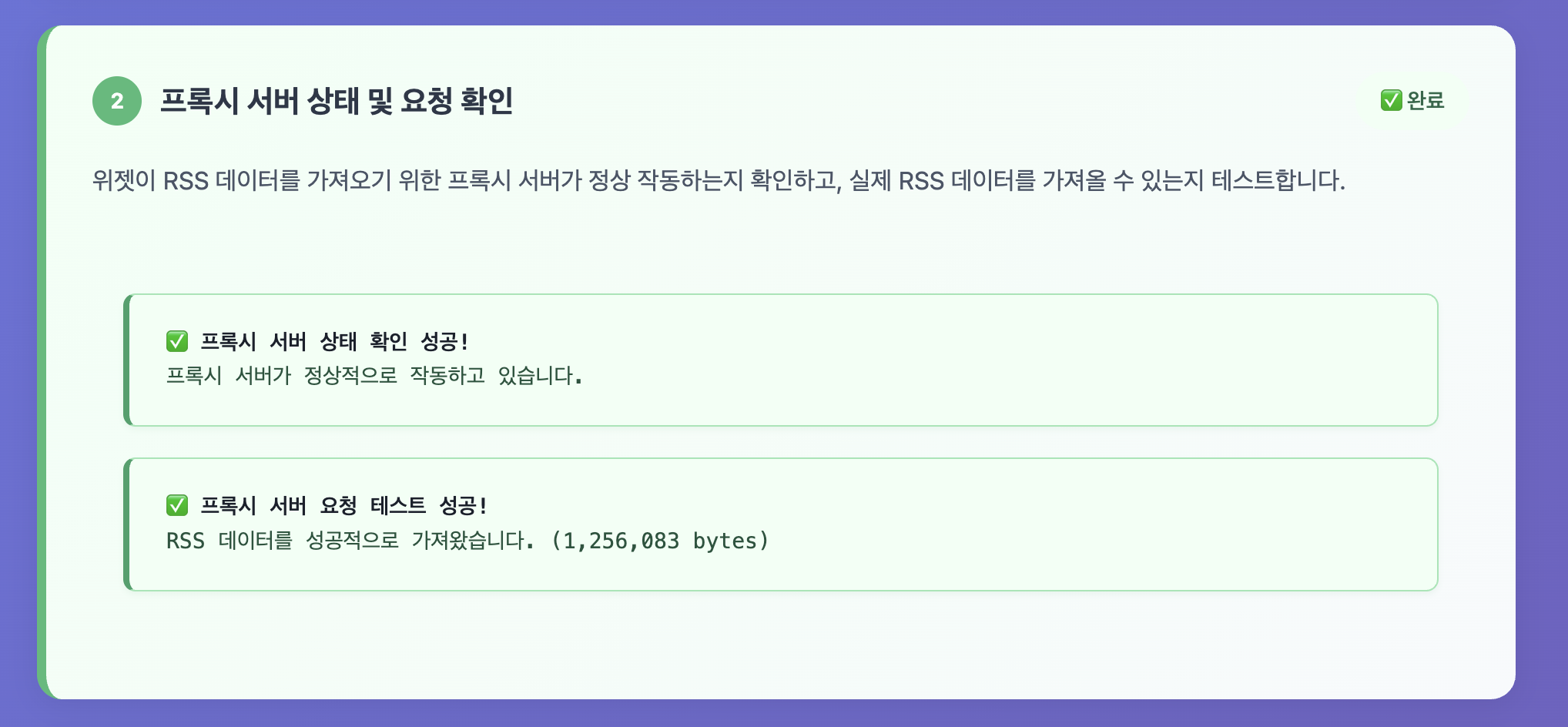 위젯이 RSS 데이터를 가져오기 위한 프록시 서버가 정상 작동하는지 확인하고, 실제 RSS 데이터를 가져올 수 있는지 테스트합니다.