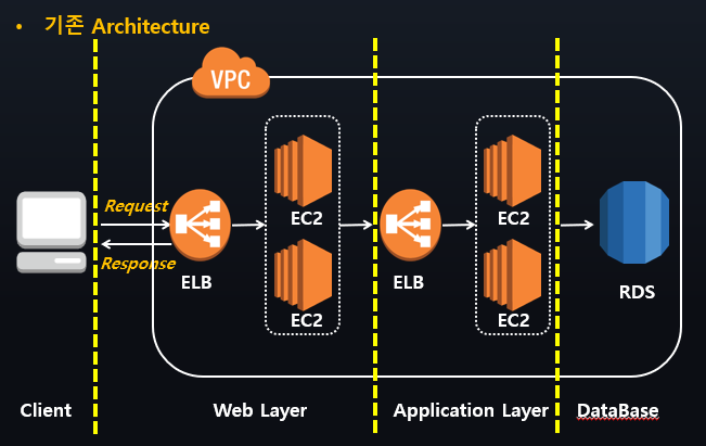 외부 Client에 의해서 request가 들어오면, 외부 ELB를 통해서 EC2서버로 로드밸런싱되고,(web 레이어단)